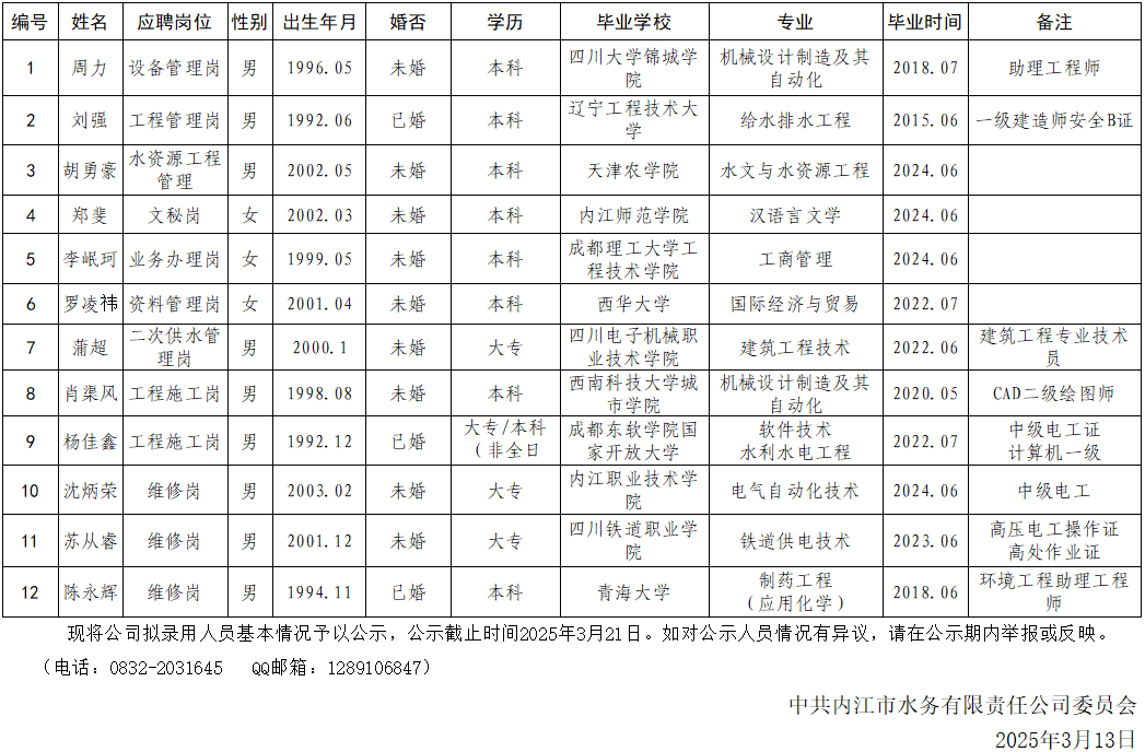 內(nèi)江市水務(wù)有限責(zé)任公司2025年3月擬招聘人員公示情況表